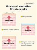 این ماده که در قلب فرمولاسیون این محصول قرار دارد، غنی از مواد مغذی همچون گلیکوزامین وگلیکان ها، اسید هیالورونیک، ویتامین ها و پپتیدها است. ترشحات حلزون به ترمیم بافت های آسیب دیده پوست، کاهش علائم پیری، و حفظ رطوبت در پوست کمک میکند. همچنین، این ماده دارای خواص ضد التهابی و آنتی اکسیدانی است که از پوست در برابر آسیب های محیطی محافظت میکند.
